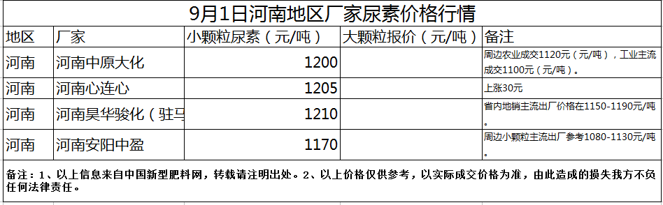 9月1日河南地區尿素價格行情